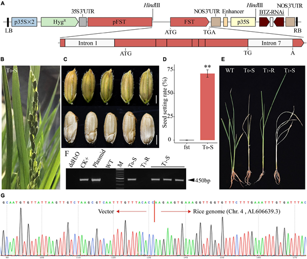 隨后,研究團(tuán)隊(duì)在該校稻作研究所植物分子育種實(shí)驗(yàn)室構(gòu)建了用于轉(zhuǎn)基因水稻雌性育性互補(bǔ)的FST基因表達(dá)元件,以及用于轉(zhuǎn)基因篩除的苯達(dá)松除草劑敏感致死的功能性RNAi元件,并將其緊密連鎖后導(dǎo)入水稻雌性核不育系中,成功創(chuàng)制了基因工程水稻雌性不育系,實(shí)現(xiàn)了非轉(zhuǎn)基因雌性核不育系種苗的繁殖。