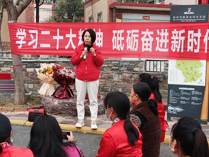 10月27日,在河南省林州市黃華鎮(zhèn)廟荒村村口,黨的二十大代表、廟荒村黨支部書記郁林英和鄉(xiāng)親們分享參加黨的二十大的感受和收獲。新華社發(fā)