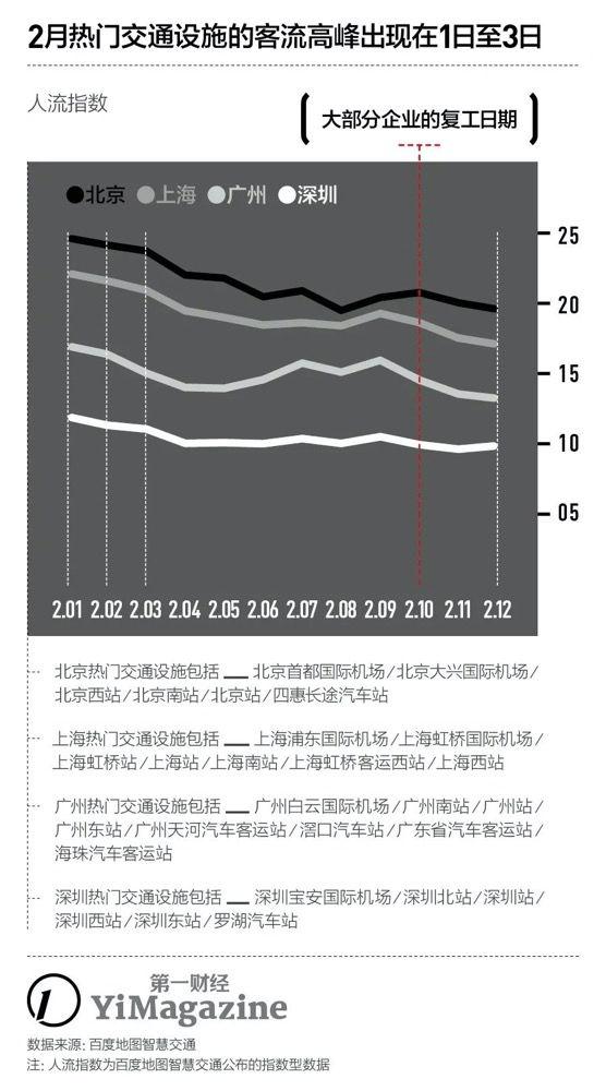 根據(jù)百度地圖智慧交通的數(shù)據(jù),2月至今,這些城市機(jī)場(chǎng)、高鐵站、普鐵站、汽車站等重要交通樞紐的人流規(guī)模全部呈現(xiàn)隨時(shí)間推移緩慢下降的趨勢(shì):人流高峰期出現(xiàn)在2月初的1日至3日,4日至10日間保持震蕩,10日以后人流規(guī)模逐日縮減。
