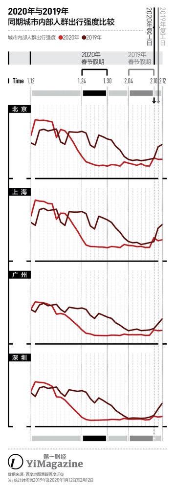 自疫情防控升級(jí)以來(lái),各城市都有大批航班、鐵路班次被取消。這也從根本上抑制了交通樞紐人流暴漲的可能性。4座城市中,僅廣州在復(fù)工前夕有小幅人流回升,其余城市的波動(dòng)整體平穩(wěn)。