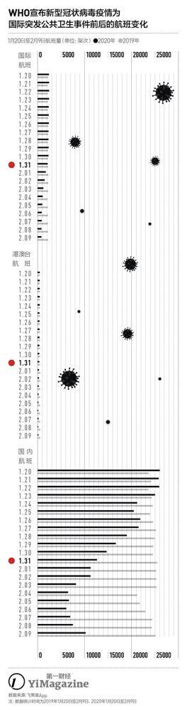 飛常準(zhǔn)的數(shù)據(jù)顯示,在世衛(wèi)組織公布結(jié)果之前,每天的國(guó)際航班量依舊比去年同期多。但1月31日之后國(guó)際航班量急劇下降,1月31日至2月9日,國(guó)際航班與2019年同期相比減少了9891架次。